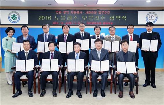 [세종TV-황대혁 기자] 대전광역시는 건강한 자원봉사 도시 대전을 만들기 위해 31일 11시 시청 중회의실에서 10개 기업 등과‘노블레스 오블리주(Noblesse Oblige) 협약’을 체결했다고 밝혔다.