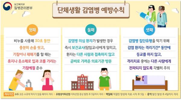한편 질병관리본부는, 단체생활을 하는 어린이집, 유치원, 초·중학교 등에서의 감염병 집단유행을 막기 위해, 다음과 같은 ‘단체생활 감염병 예방수칙’ 준수를 강조했다.