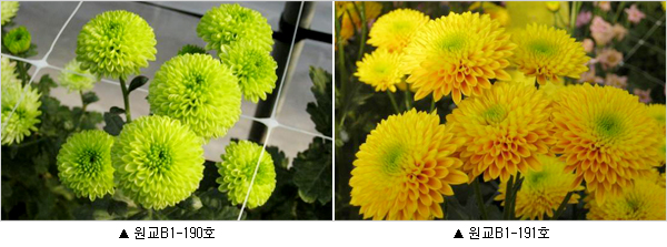 올해 새로 개발해 첫 선을 보이는 '원교B1-190호'는 꽃이 중간 크기인 녹색 폼폰형 겹꽃 계통으로 꽃모양이 안정적이며 연중 꽃색이 일정한 특징이 있다.