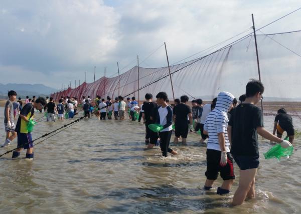 물이 빠진 그물에 숭어, 농어, 새우 등이 갇히면 관광객들이 들어가 맨손으로 잡는다.