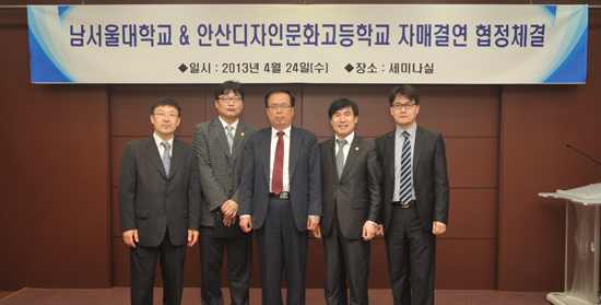 남서울대학교(총장 공정자)가 24일 남서울대 세미나실에서 안산디자인문화고등학교(교장 김상길)와 자매결연 협정 체결식을 가졌다.