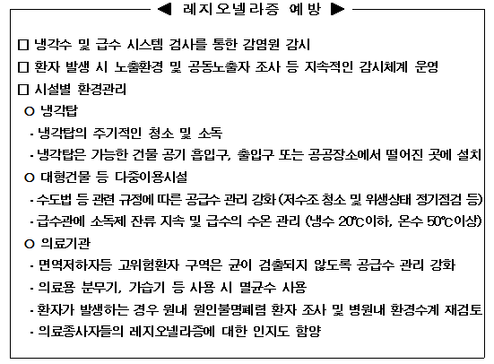 질병관리본부는 이번 사례를 통해 레지오넬라증 예방을 위해 저수조 등 급수설비의 관리가 중요하다는 사실을 다시 한 번 확인했다고 밝히고, 공동주택이나 다중이용시설의 냉각수 및 급수설비 관리와 더불어 중앙집중식 온수의 수온관리 및 소독 등의 관리를 철저히 해 줄 것을 당부했다.