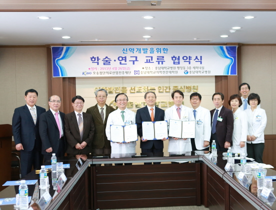 충남대학교병원(원장 송시헌)와 충남대학교의학전문대학원(원장 송민호), 오송첨단의료산업진흥재단 (이사장 윤여표)는 26일(금) 행정동 3층 세미나실에서 학술·연구 교류를 통하여 신약개발을 꾀하기위해 협약식을 가졌다.<사진>