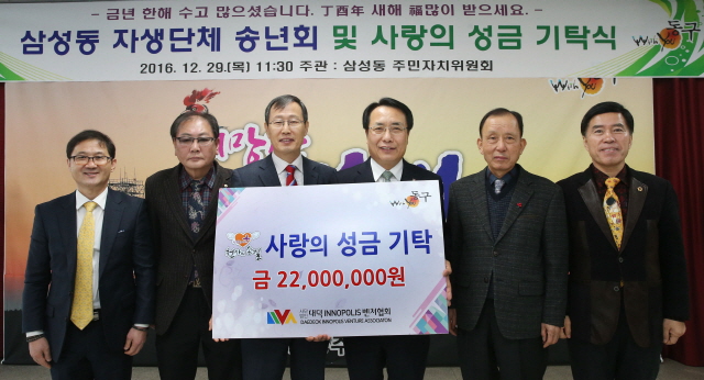 대전 동구(구청장 한현택)는 29일 삼성동주민센터에서 (사)대덕이노폴리스벤처협회(회장 이종포)가 동구에 거주하고 있는 저소득가정을 위해 써달라며 구 대표 복지브랜드인 ‘천사의 손길 행복+’ 운동에 성금 2200만 원을 기탁했다고 밝혔다.