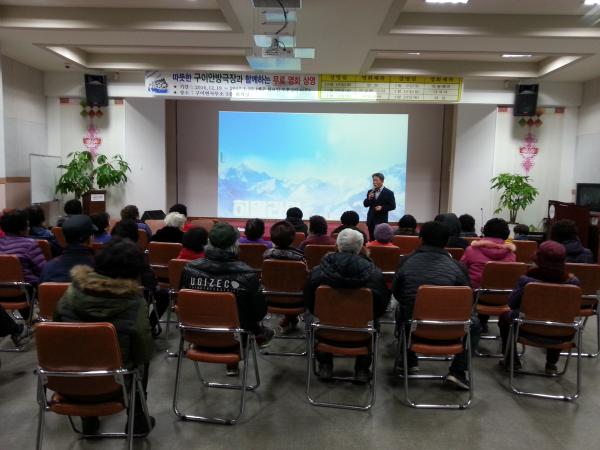 구이면사무소에서는 문화나눔의 일환으로 농한기를 맞이하여 무료한 어르신들에게 따뜻한 겨울나기를 위해 지난해 12월 19일부터 오는 23일까지 추억의 영화를 무료로 상영하는 ‘따뜻한 구이안방극장’을 운영하고 있다.