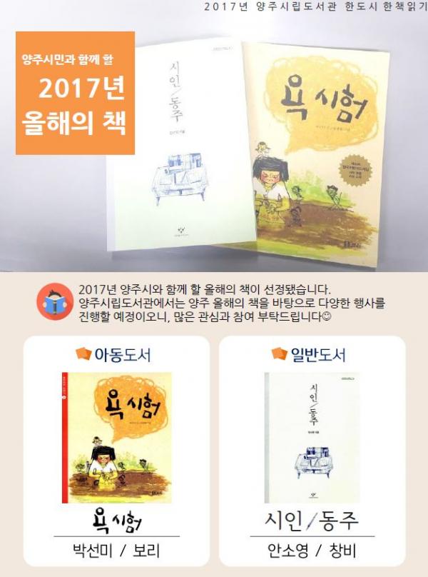 양주시는 ‘양주의 책’은 양주를 대표하는 책으로 한 권의 책으로 시민이 함께 공감하고 소통하는데 다리 역할을 하는 것으로 매년 선정되며, 올해는 박선미 작가의『욕 시험』(아동도서)과 안소영 작가의『시인 동주』(일반도서)가 선정됐다고 밝혔다.