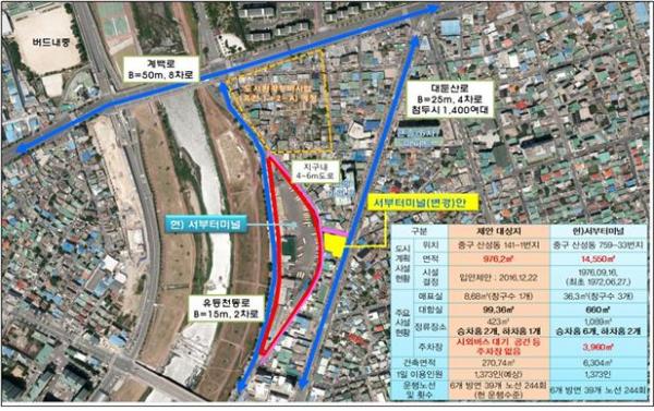 지속 가능한 교통체계를 위한 대전광역시 교통정비중기계획 등에서 통합터미널로 관리하고자 하는 상위계획과 부합하지 않고 대상지와 주변 환경을 고려한 입지 여건 상 도시관리계획 결정 기준에 불부합하며 지역간 연계교통수단 등 이용시민의 접근성이 부족하고 면적 또한 현재 시설의 6.7% 수준으로 매우 협소하여 이용객 및 종사자 등을 위한 시설이 부족하고 차량 진·출입 및 여객 등의 이용에 상당한 불편과 안전상의 문제가 있을 것으로 예측되기 때문이다.