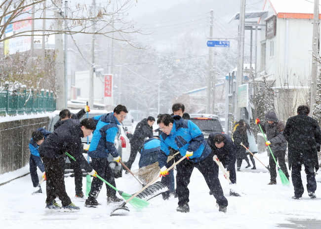 장종태 서구청장은 지난 20일 주민, 직원 등 30여 명과 함께 기성동 주민센터 주변 이면도로 제설작업에 나섰다.