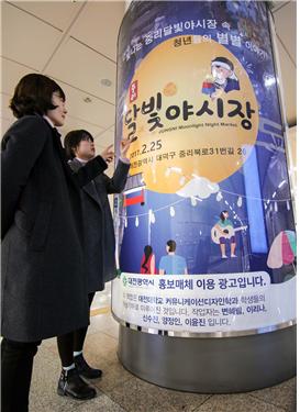 [세종TV-황대혁 기자] 대전광역시는 제2차 홍보매체 이용대상으로 선정된 12개 법인 및 단체에 대하여 시가 보유하고 있는 도시철도 역사 광고판 등 홍보매체를 개방, 관내 대학 디자인 재능기부로 기획된 홍보물을 게시하여 홍보를 지원한다고 밝혔다.