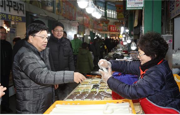 권 시장은 이어 설 명절 대목을 앞둔 전통시장을 찾아 도마시장으로 발길을 옮겼다