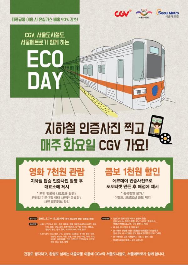 서울도시철도공사와 서울메트로는 지난해 7월부터 연말까지 CJ CGV와 시행해온 지하철 이용시민 할인 이벤트인 ‘에코데이(ECO-DAY)’를 올해에는 대상 상영관 범위를 크게 확대하여 보다 많은 지하철 이용시민들에게 혜택이 돌아갈 수 있도록 기획했다.