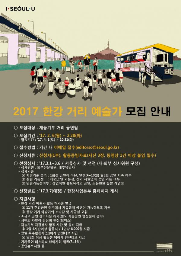 또한 ‘한강거리예술가’는 7~8월 중 한강공원에서 펼쳐질 <2017 거리공연 페스티벌>에 참여할 수 있다.