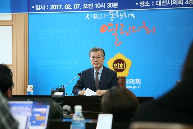문 전 대표는 이날 대전시의회에서 김경훈 대전시의회 의장 등이 지켜본 가운데 기자간담회를 가졌다.