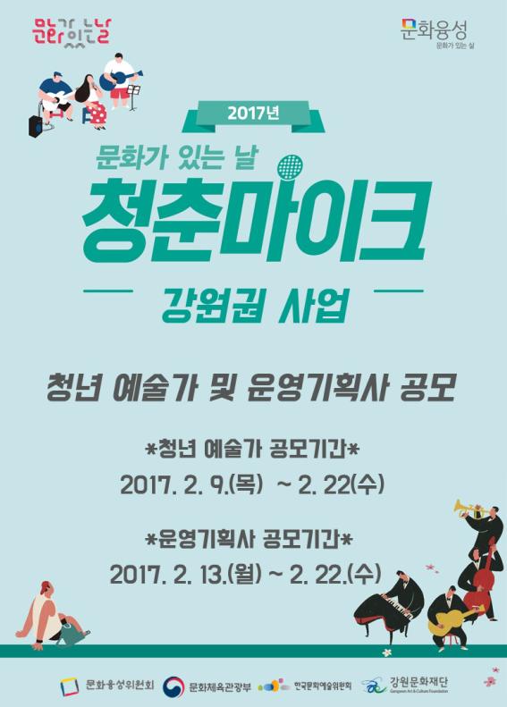 강원문화재단 관계자는 “이번 청춘마이크 사업에 도내의 청년 예술인 및 관련 단체들의 적극적인 참여를 부탁드리며, 청춘 마이크 사업을 통해 청년 문화예술인들의 끼를 마음껏 발산하고, 관객들과 소통하여 앞으로 문화예술인으로서 성장할 수 있는 기회가 되었으면 한다.”고 밝혔다.