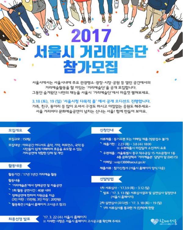 [세종TV-세종TV] 서울시는 올 4월부터 예술활동을 하는 개인이나 동아리들의 숨은 끼와 솜씨를 마음껏 펼칠 수 있는 ‘거리예술존’ 운영을 위해 오는 23일(목)부터 3월 8일(수)까지 ‘거리공연예술’단을 모집한다고 밝혔다.