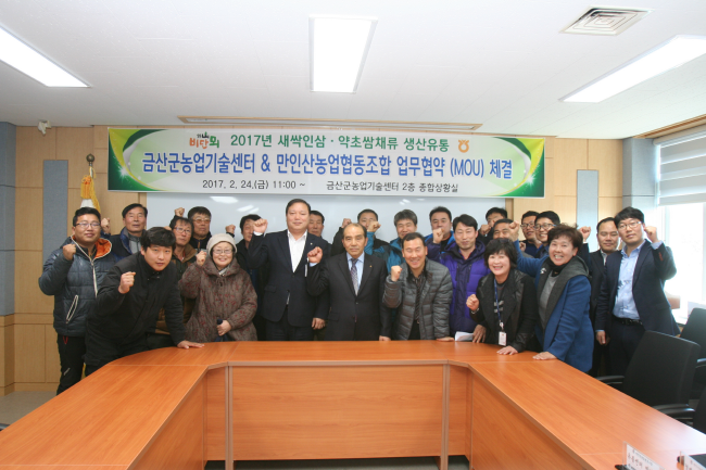 【세종TV-김광무 기자】금산군농업기술센터(소장 이갑수)와 만인산농업협동조합(조합장 전순구)이 24일 농업기술센터에서 신소득 작목인 금산 새싹인삼과 약초 쌈 채류의 생산, 유통지원을 위한 업무협약을 체결했다.