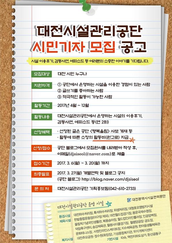 [세종TV-황대혁 기자] 대전시설관리공단은 시민과의 소통을 활성화하기 위해 지난 6일부터 2주간 ‘대전시설관리공단 시민기자단’을 모집한다고 밝혔다.