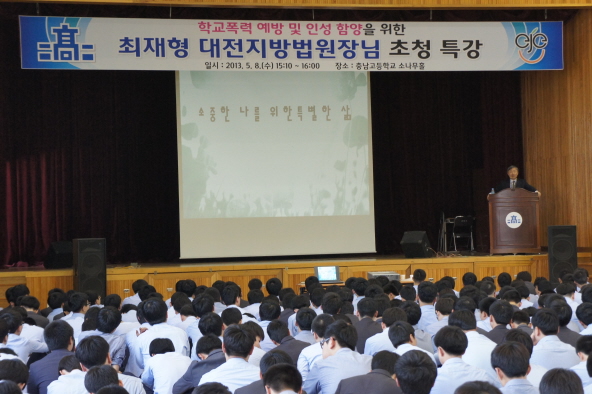 충남고(교장 김동문)는 5월 8일(수) 15시 최재형 대전지방법원장이 8일 충남고 학생들을 대상으로 강연을 펼쳤다. 이날 오후 3시 충남고 소나무홀에서 1학년 학생 425명을 대상으로 ‘소중한 나를 위한 특별한 삶’이라는 주제로 특강을 가졌다.