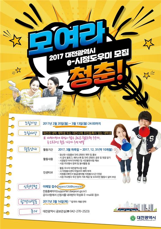 [세종TV-황대혁 기자] 대전광역시는 젊은 감각으로 시민과 소통하는‘2017 대전광역시 e-시정도우미’를 오는 13일까지 모집한다고 밝혔다.