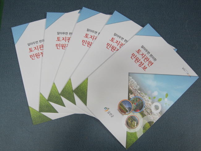 책자에 수록된 내용은 개별공시지가, 개발부담금, 부동산 거래신고, 외국인의 토지 취득 허가․신고, 지적재조사, 지적측량, 공유토지분할특례법, 토지이동 신청, 조상 땅 찾기, 도로 명 주소, 민원24 서비스, 자동차이전, 여권발급 등 주민이 알아두면 편리한 토지정보와 생활민원 정보를 담았다.