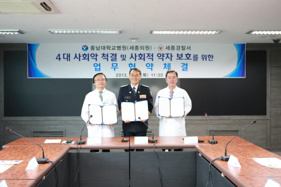 충남대학교병원 (원장 송시헌), 세종경찰서 (서장 심은석), 충남대학교병원 세종의원 (의원장 이준규)는 9일(목) 11시 30분 충남대병원 세종의원에서 4대 사회악 척결 및 사회적 약자의 건강증진과 편안하고 행복한 삶을 도모하고자 협약식을 개최했다.