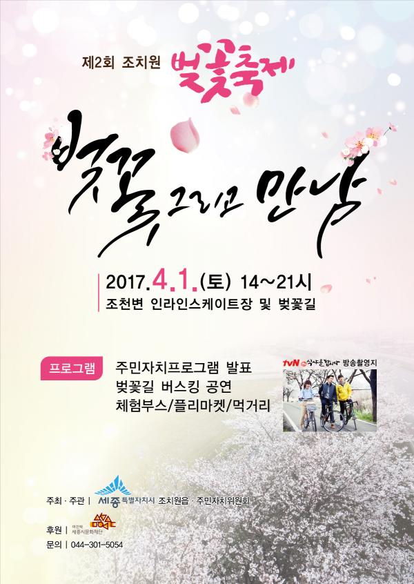 [세종TV-황대혁 기자] 세종특별자치시 북세종통합행정복지센터(조치원읍)가 오는 4월 1일 조천변 인라인스케이트장과 벚꽃길 일원에서‘벚꽃 그리고 만남’이라는 주제로 ‘제2회 조치원 벚꽃축제’를 개최한다고 밝혔다.