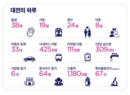 이에 따르면 대전시는 하루 평균 △38명 출생으로 절반 이상이 서구·유성구(22명)에서 출생하였으며, △19명 사망, △24쌍 혼인, △8쌍의 부부가 이혼을 한 것으로 나타났다.