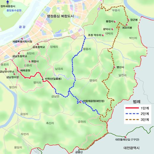 3단계 사업은 금천리 임도 삼거리에서 행복도시 경계에 이르는 22.8㎞를 산악자전거 및 숲속 산림욕 체험 누리길 코스로 만들 예정이다.