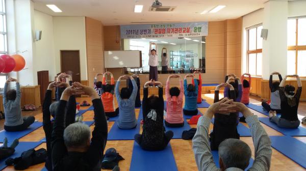 관절염 자기관리 교실 프로그램 내용은 낙상예방을 위한 균형감각 향상 운동과 혈액순환을 원활하게 하는 체조, 우울증 해소를 위한 체조 및 뇌 체조를 통해 두뇌에 필요한 산소를 공급하여 뇌 기능을 활성화 시키는데 도움을 줄 수 있는 운동으로 진행하여 참여자들이 몸과 마음의 변화를 스스로 느끼게 하여 지속적인 운동습관을 키워 줌으로서 건강에 대한 기대감을 높이는데 목적을 두고 운영한다.