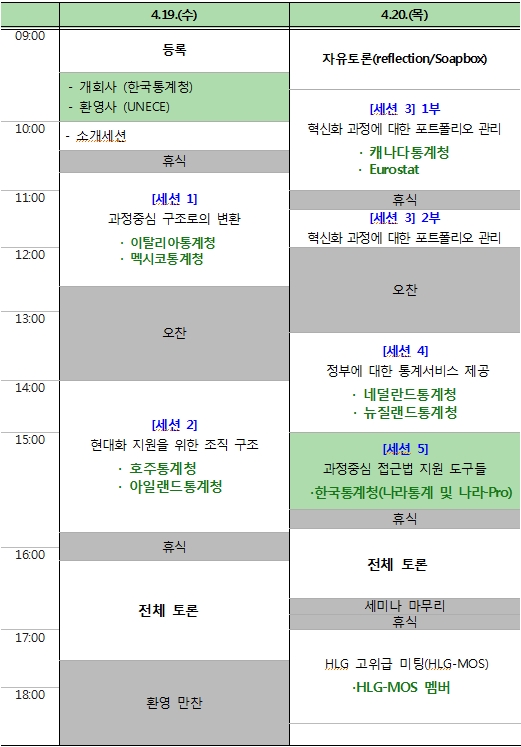 통계청은 유엔유럽경제위원회(UNECE)와 공동으로 ‘17.4.19∼20일 동안 서울 플라자호텔에서'공식통계현대화 고위급(HLG) 국제 세미나 : 과정중심의 통계생산 표준화'를 개최한다고 밝혔다.