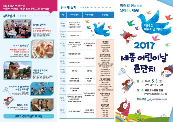 [세종TV-황대혁 기자] 세종특별자치시가 오는 5월 5일 세종호수공원에서 ‘2017 세종어린이날 큰잔치’를 개최한다고 밝혔다.