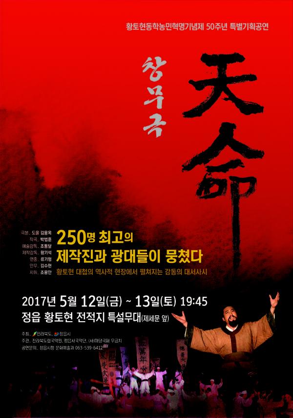 ‘천명’은 도올 김용옥(철학자) 대본, 국악 작곡의 대가 박범훈(전중앙대총장) 작곡의 작품이다. 여기에 최고의 창극·마당극 연출가인 류기형이 연출을 맡고 전북도립국악원 창극단장인 조통달이 예술감독, 대한민국 창극계의 국민배우 왕기석(정읍시립국악단장)이 제작 총감독으로 참여한다.