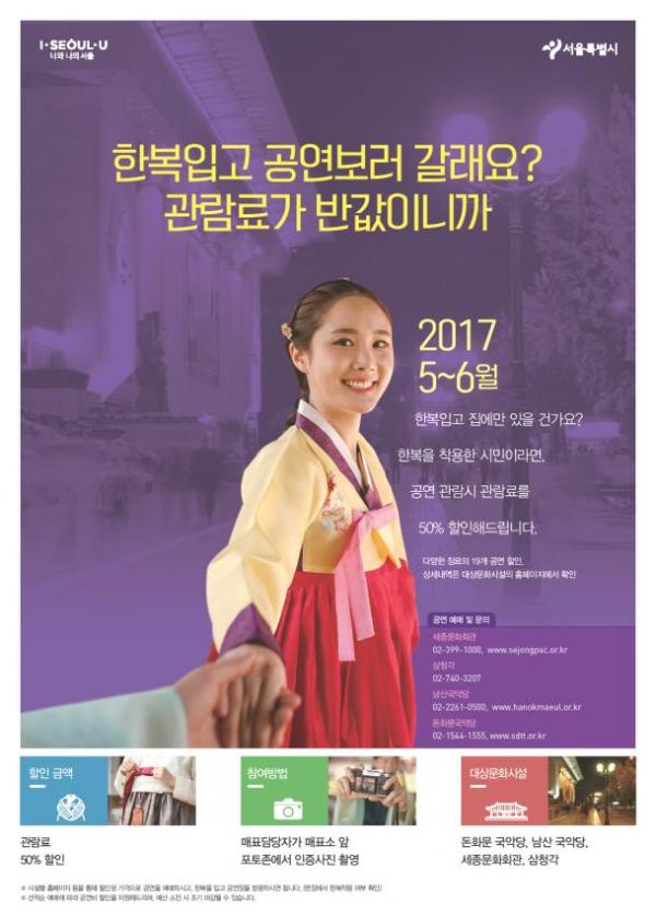서울시는 ‘일상 속에서 한복입기’ 문화를 장려하고자, 한복을 입고 시에서 운영하는 문화공연 시설에 방문하면, 입장료를 50% 할인해준다. '뮤지컬 밀사', '서울시국악관현악단 세종음악기행', '서편제' 등 세종문화회관, 남산 국악당, 서울돈화문 국악당, 삼청각에서 열리는 19개 명품 문화공연을 저렴한 가격으로 즐겨보자.