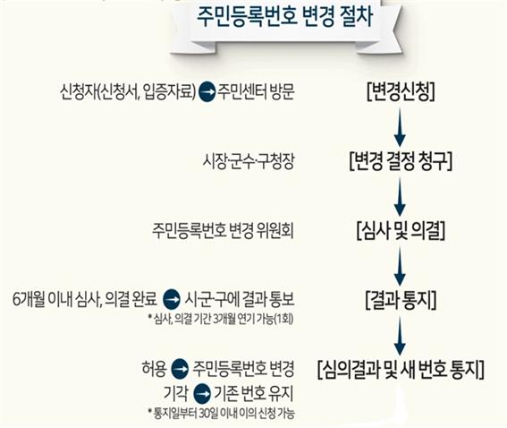 변경절차는 입증자료를 준비해 주민등록지 동주민센터에 제출하면 구청장이 주민등록번호변경 결정 청구하여 행정자치부 주민등록번호변경위원회의 심의를 거쳐 주민등록번호 변경이 최종 결정된다.