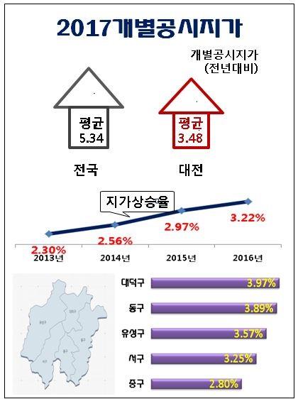 시에 따르면 금년도 개별공시지가는 대전산업단지 재생지구(대화·읍내동), 도안갑천지구 친수구역 조성사업, 구봉지구, 구암동 복합터미널 등 개발사업지역에 대한 개발 기대심리와 실거래가격과 공시지가의 격차율 해소를 위한 조정 등으로 전년대비 평균 3.48%(전국 평균 5.34%)가 상승했으며, 구별로는 대덕구(3.97%↑), 동구(3.89%↑), 유성구(3.57%↑), 서구(3.25%↑), 중구(2.80%↑)순으로 상승한 것으로 나타났다.