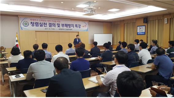 [세종TV-황대혁 기자] 대전광역시 건설관리본부는 지난 7일 시청 세미나실에서 공사·계약·민원 등이 집중돼 있는 건설분야 부정부패 척결을 위한 ‘청렴실천 결의 및 부패방지 특강’을 실시했다고 밝혔다.