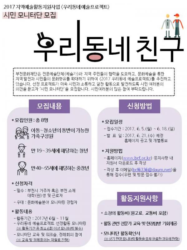 총 8명 규모로 선발 예정인 모니터단 ‘우리동네친구’는 프로젝트에 선정된 단체 및 예술가들의 추진 프로젝트를 대상으로 6월부터 11월까지 현장 모니터링을 수행할 예정이다. 재단은 선발 인원을 대상으로 소정의 활동비도 지원한다.