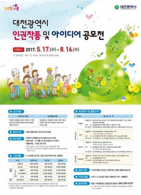 이번 공모전은 인권과 관련된 캐릭터, UCC, 포스터 등 인권작품 부문과 대전에 인권존중 문화 확산을 위한 인권정책 아이디어 부문에 응모할 수 있으며 응모자격은 지역, 연령 제한없이 전 국민 누구나 참여 가능하다.