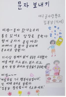 한편, 2016 대구 성인문해교육 시화전 시상식은 2016년 9월 8일 대구 이월드에서 개최했으며, 대상 1명, 최우수상 2명, 우수상 3명, 장려상 5명, 입상 48명으로 총 59명 시상했다. 시화전은 1차는 대구시청 에서, 2차는 반월당역 지하 중앙광장에서 개최했으며 시민 500여명이 전시회를 관람했다.