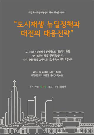 대전도시재생지원센터 개소 2주년을 기념해 마련한 이번 세미나 에서는 새 정부의 도시재생 뉴딜정책과 이에 대응하는 대전시 도시재생정책 방향 및 대전도시재생지원센터의 도시재생 지원시스템에 대해 논의할 계획이다.