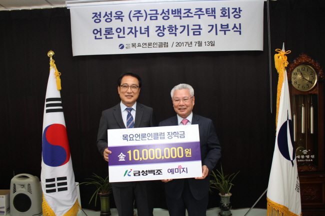 금성백조주택(회장 정성욱)이 목요언론인클럽(회장 곽영지)에 언론인 자녀 장학금으로 써달라며 1천만 원을 기탁하였다.