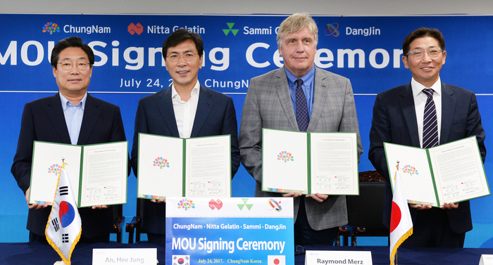 충남도는 24일 도청 상황실에서 안희정 지사와 일본 니타젤라틴(Nitta Gelatin) 레이먼드 머즈 대표, 삼미산업㈜ 김경림 대표, 김홍장 당진시장이 참석한 가운데 투자협약을 체결했다고 밝혔다.