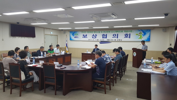 충남 계룡시(시장 최홍묵)가 지난 7일 시청 상황실에서 ‘연산천 지방하천 정비사업 및 연산천변 도시계획도로 개설사업’에 편입되는 토지 및 지장물 등에 대한 보상협의회를 개최했다.