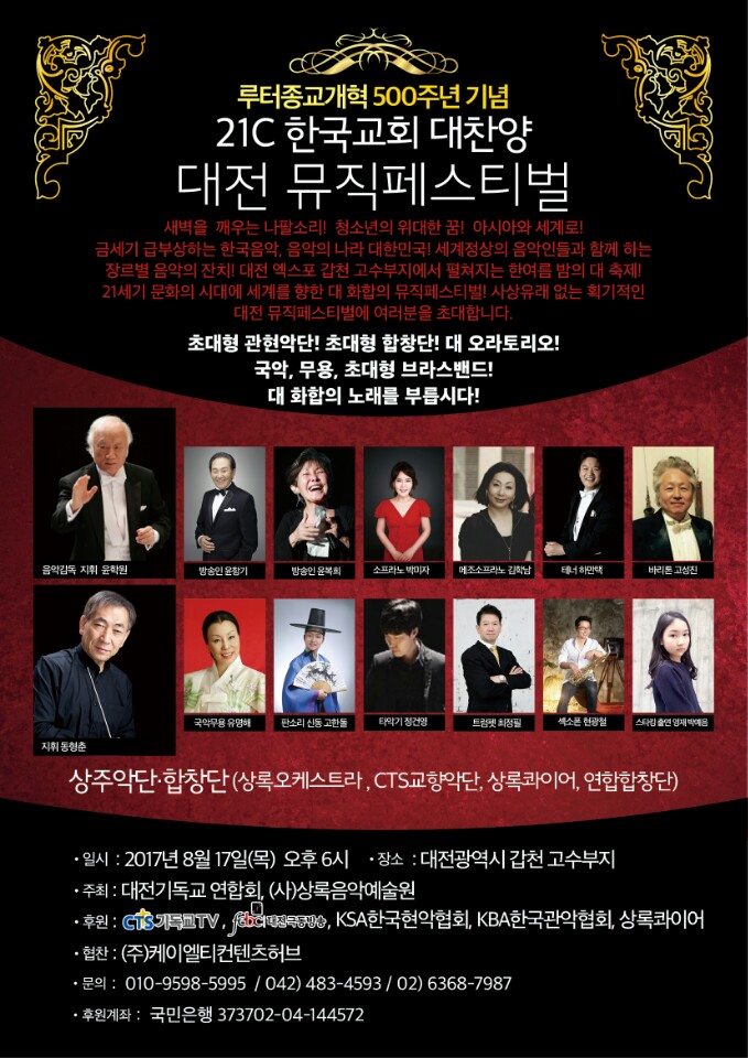 한국교회 대찬양'2017 대전 뮤직 페스티벌'(대전Music Festival)이  오는 17일 오후 6시 대전 갑천고수부지에서 개최된다.