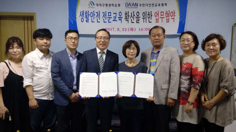 대덕구(구청장 박수범)는 "지난 22일 대덕구평생학습센터에서 사단법인 국민다안전교육협회(대표 최헌규)와 이 지역의 생활안전 전문교육 확산을 위한 업무협약을 체결했다."고 밝혔다.