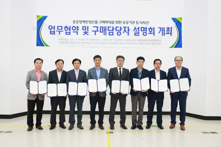 대전시설관리공단은 18일 중증장애인 생산품 구매확대와 일자리 창출을 위해 9개 공공기관과 업무협약을 체결했다.(사진제공=대전시)