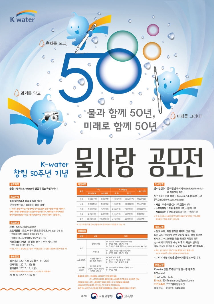작품은 K-water 홈페이지(www.kwater.or.kr)나 우편으로 접수할 있으며, 마감은 2017년 11월 3일이다.