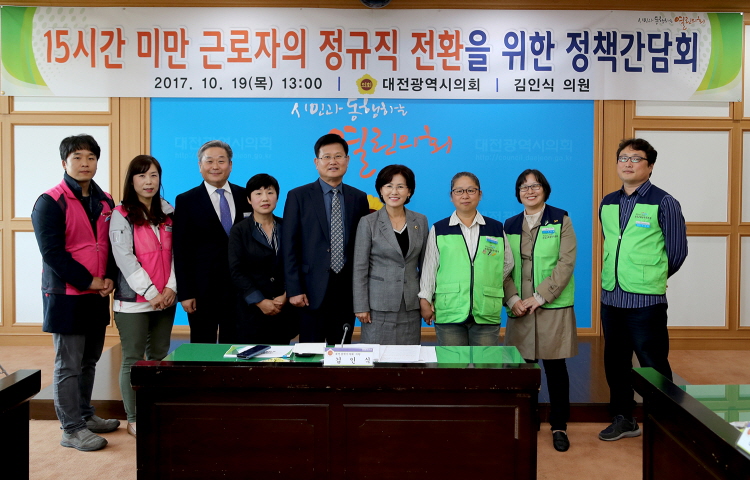 주당 15시간 미만 근로자 정규직 전환 방안 마련 대전시의회 김인식 의원은 18일 의회 대회의실에서 대전시교육청 15시간 미만 근로자의 정규직 전환을 위한 정책간담회를 개최했다대전시의회 김인식 의원은 18일 의회 대회의실에서 대전시교육청 15시간 미만 근로자의 정규직 전환을 위한 정책간담회를 개최했다 저작권자 © SJB세종TV 무단전재 및 재배포 금지 김환일 기자 다른기사 보기 페이스북 트위터 카카오톡 네이버블로그 구글+ URL복사 기사공유하기