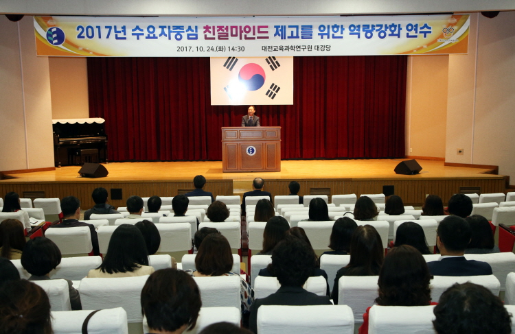 대전시 교육청은 24일 교육과학연구원 대강당에서 각급 학교 행정실장 및 기관 민원담당자들이 참석한 가운데 ‘2017년수요자 중심 친절마인드 제고를 위한 역량강화 연수를 실시했다고 밝혔다.
