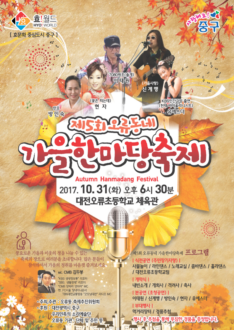 대전 중구 오류동 축제추진위원회는 30일,오류초등학교 체육관에서 주민화합을 위한 "제 5회 오류동네 가을한마당 축제" 를 개최했다고 밝혔다.